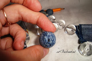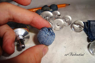 Полоски готовы, теперь обрабатываем клеем саму бусину и заворачиваем ее в джинсу как "рулетик"